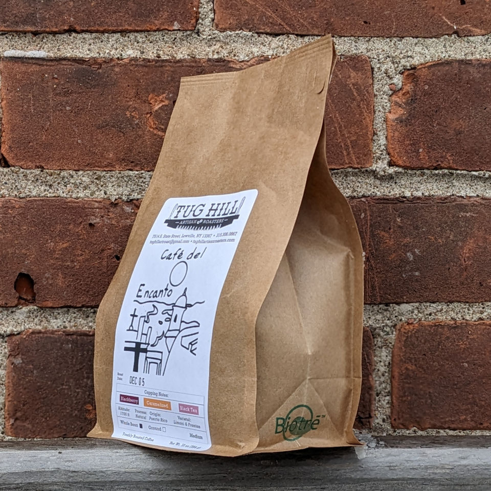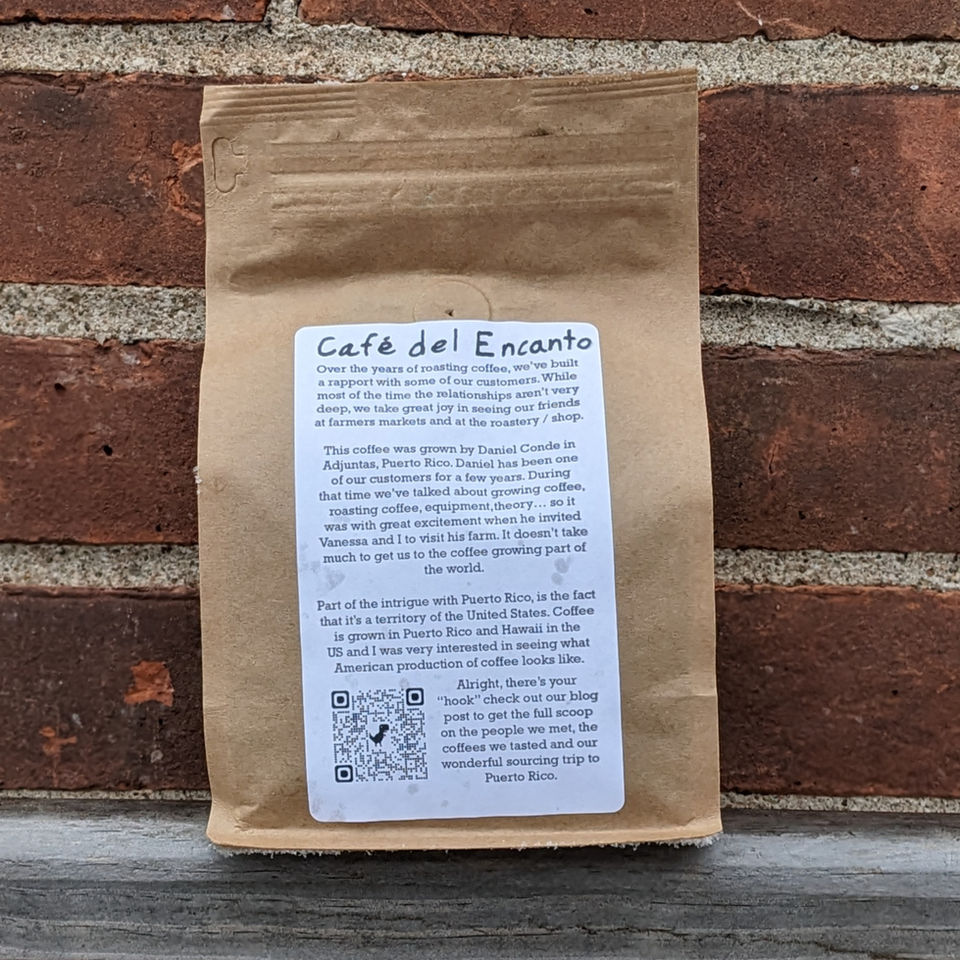 Café Del Encanto is 100% Puerto Rican coffee. We're so excited to have this coffee. This coffee comes from Daniel Counde's farm in Adjuntas, Puerto Rico. Daniel's wife, Sally, stumbled upon our coffee trailer and stand at the 4th of July festival in Old Forge, NY a few years ago. She passed the coffee on to her husband, Daniel, and he's been purchasing our coffees online ever since. Daniel roasts his own coffee on site at the farm in a Mill City coffee roaster. I wanted to learn more about Puerto Rican coffee and Daniel wanted to pick my brain about roasting. Vanessa and I were able to make a trip to Puerto Rico in October to scratch those itches. (Check out our blog entry for the full story).